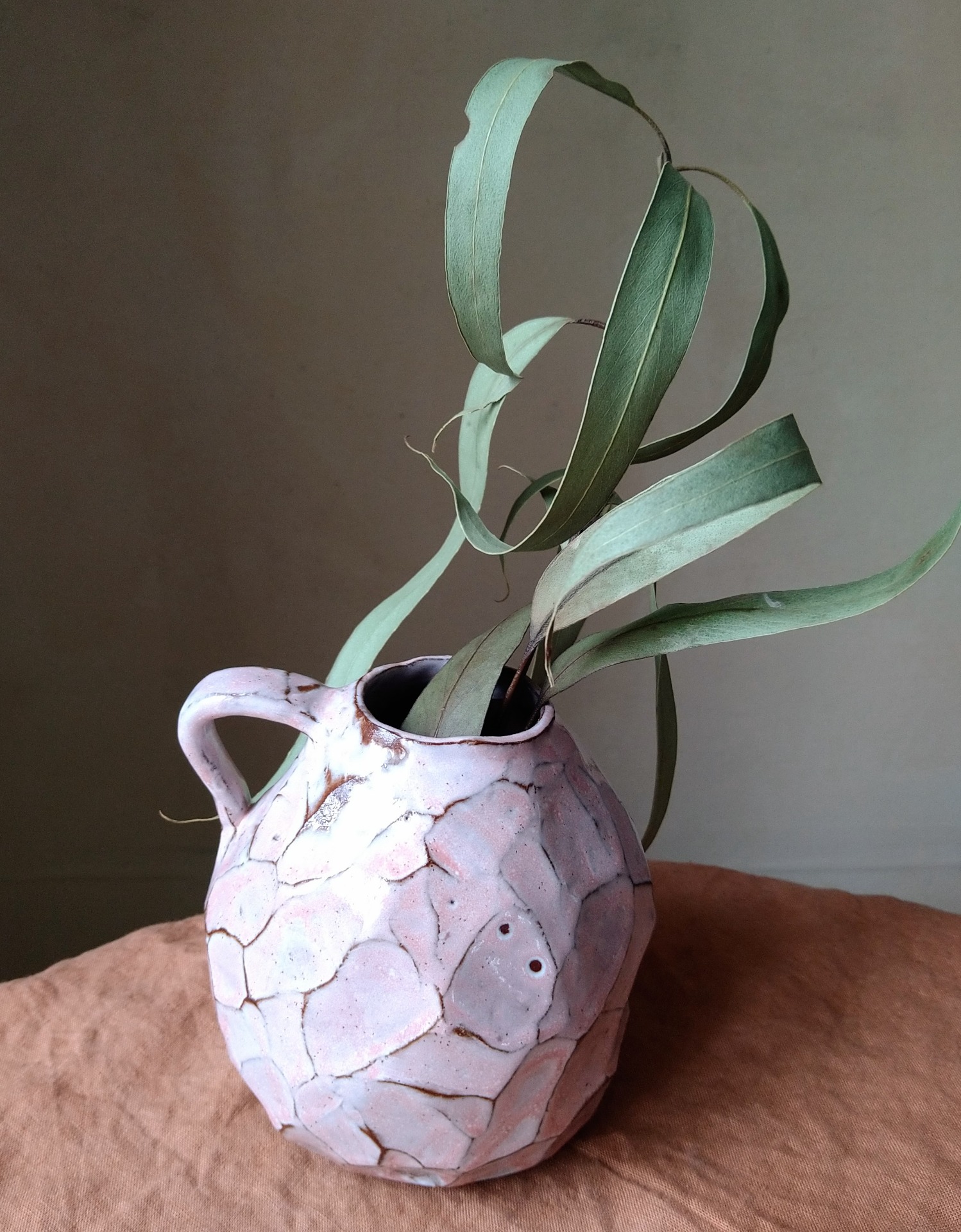 Vaaleanpunainen elävä lasitepinta, veistetty pintakuvio. Korkeus  ja halkaisia n. 13cm, epäsäännöllinen muoto.