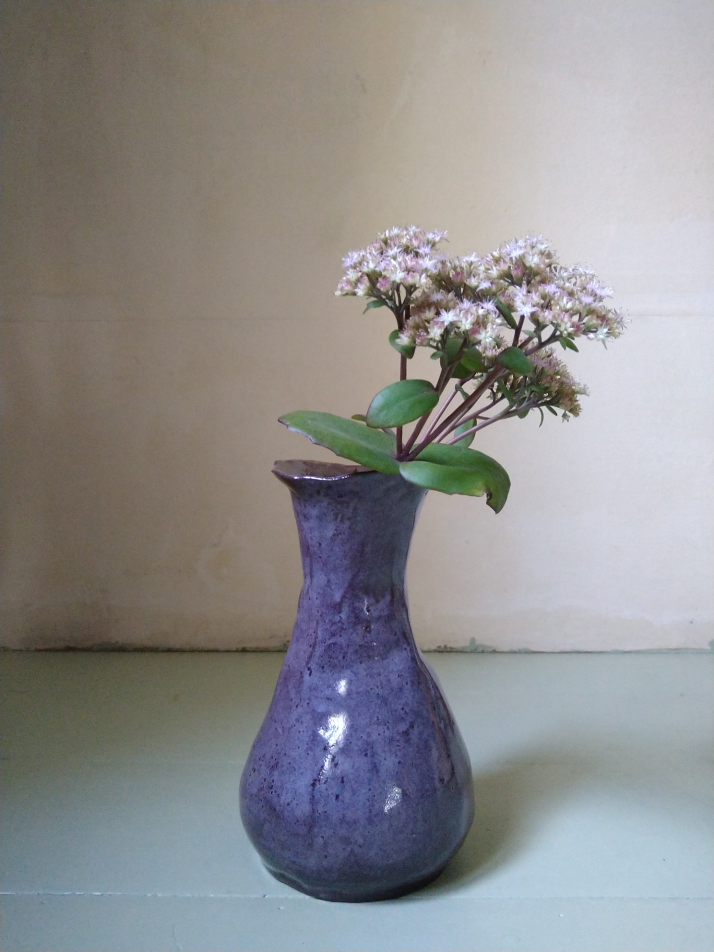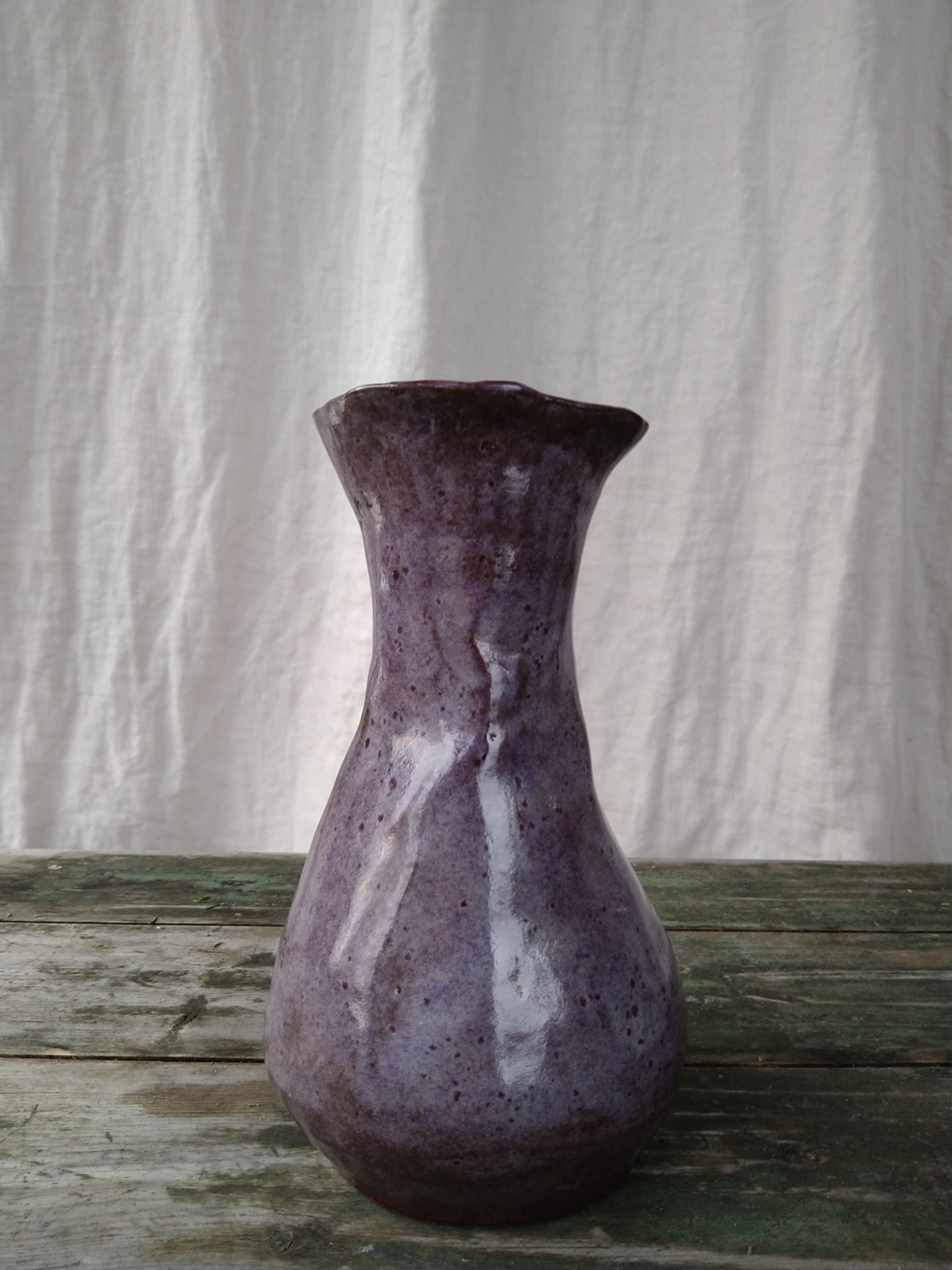 Hieman savuisen violetti, kapea ja korkea maljakko. Korkeus n. 23cm