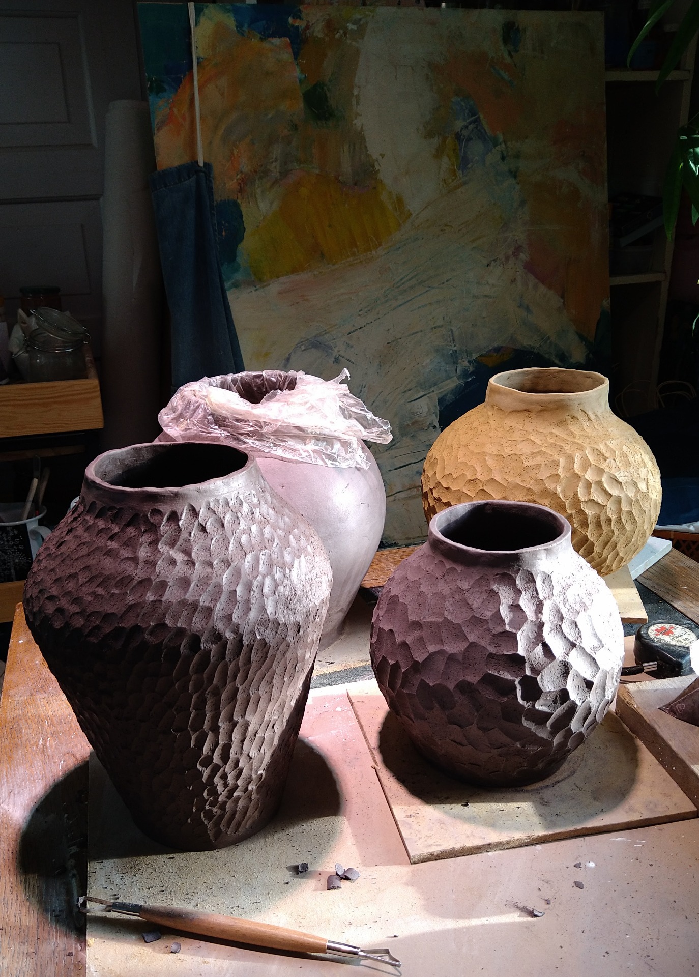Savesta teen pääasiassa ja mieluiten makkaratekniikalla maljakoita. Muodot syntyvät työn edetessä luonnollisesti savea tuntien. Savea työstäessä olen oppinut herkästi tuntemaan käsissäni sen ominaisuudet ja sen, mihin se muokkautuu ja mitä se jaksaa. Tuottaa suurta mielihyvää, kun voin työskennellä niin, että on tasapaino saven ja minun välillä. Savi ei määritä yksin sitä, mitä esineestä tulee, mutta minä en myöskään pakota savea muotoihin, mitkä ei ole sen luonteelle sopivia.